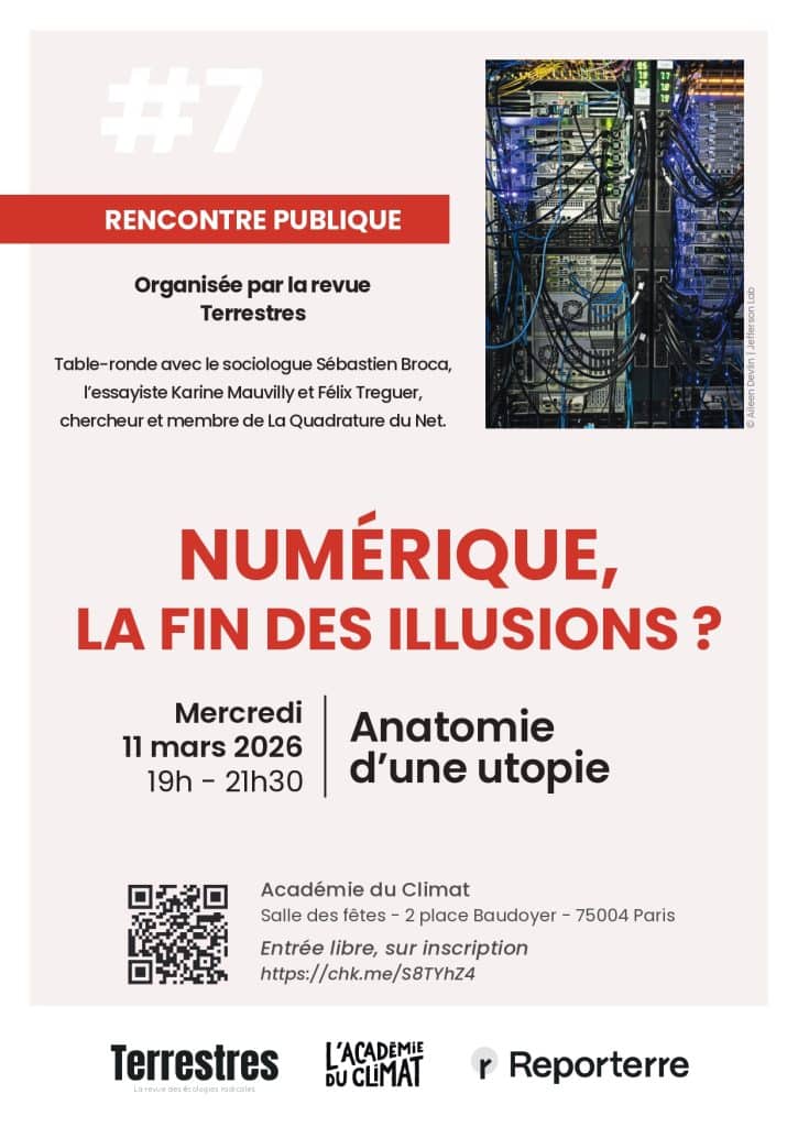 Table ronde le mercredi 11 mars avec le sociologue Sébastien Broca, l’essayiste Karine Mauvilly et Félix Treguer, chercheur et membre de La Quadrature du Net. Une rencontre organisée par Terrestres à l’Académie du Climat à Paris (19h00-21h30). Entrée libre ! Inscription souhaitée ici.