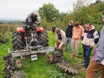 • Côté Ardéchois, des viticulteurs du Nord du département font face comme dans d'autres vignobles aux contraintes de parcelles en dévers, dont le travail du cavaillon a tendance à faire descendre la terre, au détriment des hauts de parcelles qui se voient érodées. Éliminer le travail du sol au niveau du cavaillon motive les viticulteurs, et pour se faire, il serait très pertinent d'y installer un couvert végétal pérenne, à condition qu'il ne se développe pas trop haut et qu'il ne concurrence pas la vigne. Voici le groupe parti dans une exploration tout à la fois agronomique (tester des espèces végétales semées, pour l'instant différents trèfles) et technique car il leur manque les outils pour semer sous le rang et rappuyer correctement le semis. Le rendez-vous à Autichamp a donné l'occasion aux viticulteurs du groupe de montrer une première version en test d'un module de semis latéral avec rappui, installé sur un semoir à engrais verts du commerce.