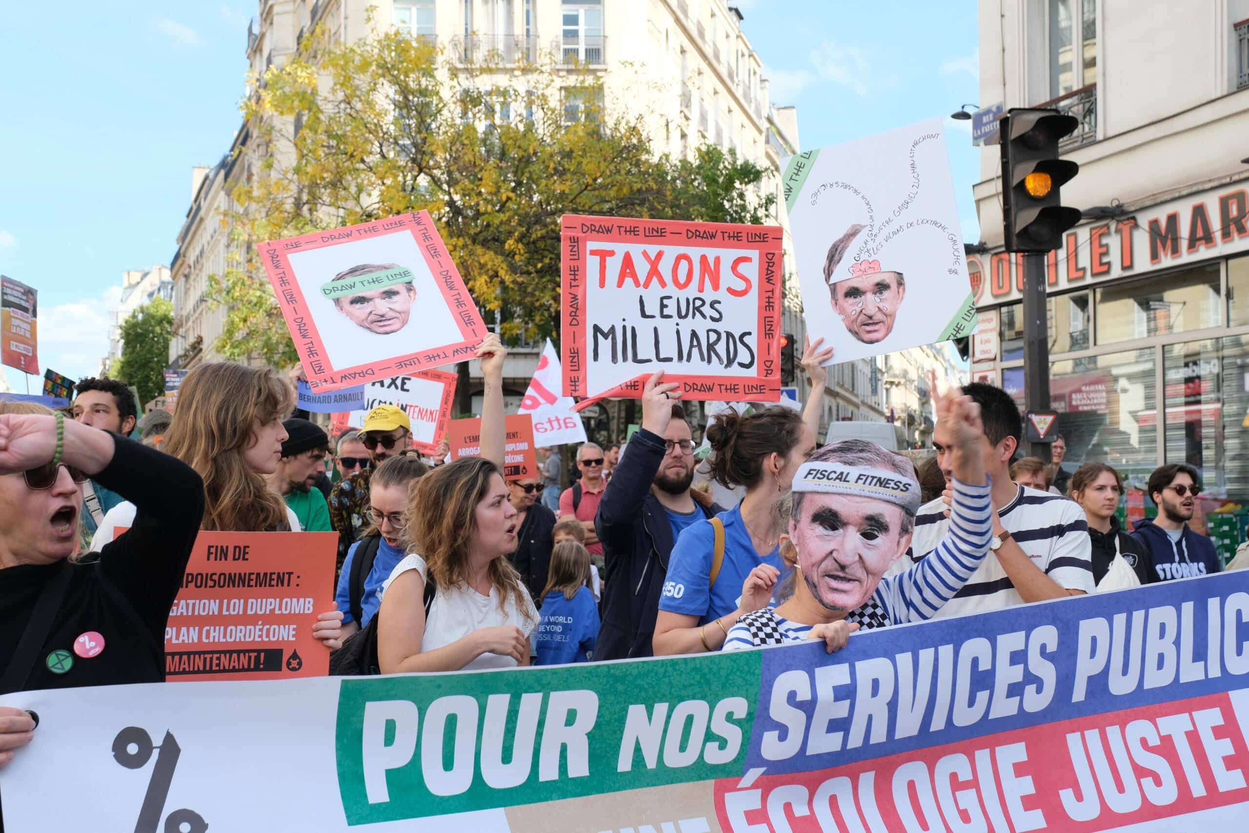 En France, la mobilisation a réuni une coalition inédite composée de plus de trois cent vingt-cinq organisations, allant des syndicats aux associations de quartiers populaires, des mouvements féministes et LGBTIQA+ aux collectifs de justice fiscale, des groupes écologistes aux organisations de solidarité internationale. Cette convergence s’inscrit dans la continuité des mobilisations du 10 et du 18 septembre, dans un contexte de contestation accrue face aux politiques d’austérité, aux inégalités qui explosent et aux impacts de la crise climatique.