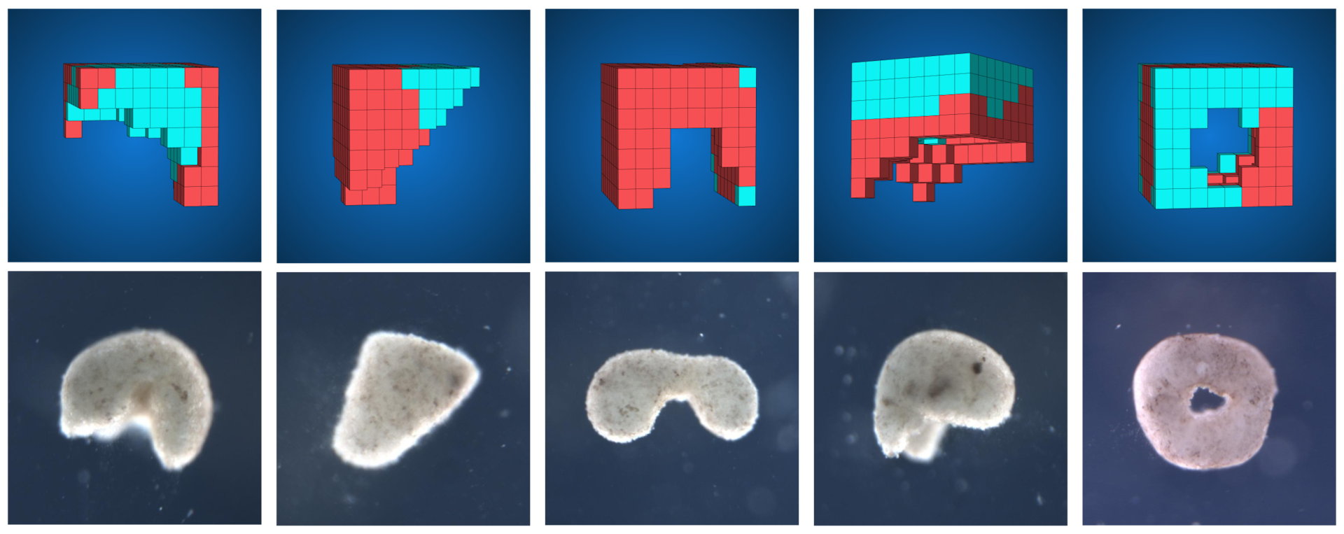 Les xénobots ont d’abord été conçus sous forme de sphères, de triangles ou de pyramides, des géométries simples choisies pour être faciles à construire, afin d’étudier de manière contrôlée la manière dont la forme et la disposition des cellules influencent le mouvement.