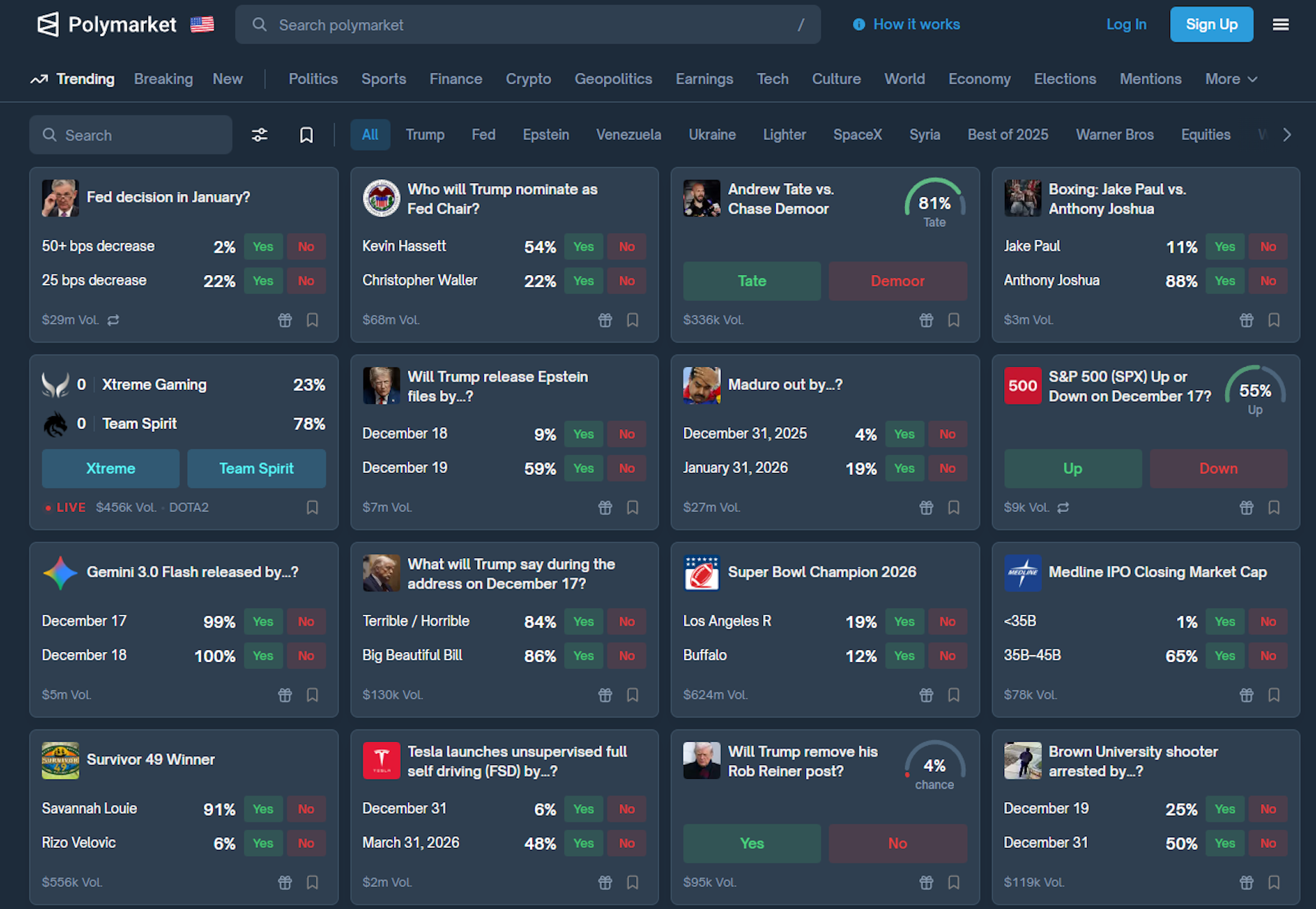 Polymarket, premier site de marché prédictifs en termes de mises, a été fondé en 2020 par Shayne Coplan, brièvement devenu le plus jeune self-made milliardaire au monde. Simple d’accès, il permet aux internautes de parier en cryptomonnaies sur toutes sortes d’événements : rencontres politiques, compétitions sportives, actualités financières et culturelles. Cette pratique connaît un essor considérable, notamment depuis l’élection présidentielle américaine de 2024, au point que certains suggèrent que les prédictions étaient alors plus fiables que les sondages dans plusieurs États indécis.
