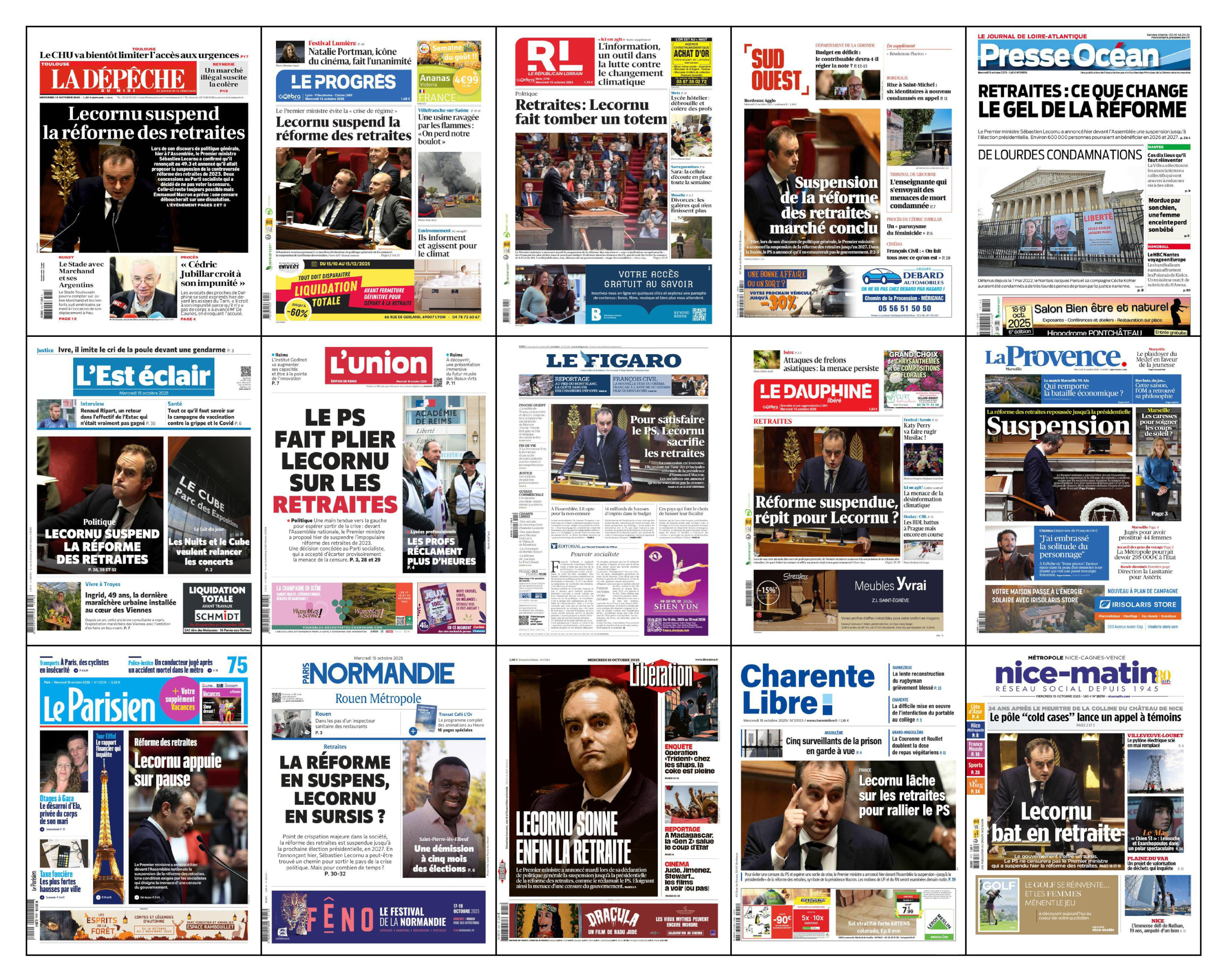 Restent enfin quelques titres pour tester certaines formules plus innovantes au registre de la désinformation. La Voix du Nord (15/10) par exemple, qui soutient qu'« en une demi-heure chrono, Sébastien Lecornu a enterré [...] la réforme des retraites » ; Presse Océan, qui déclare en gros titre le « gel de la réforme » (15/10) ; Le Figaro, qui parle de « l'abandon de la seule réforme de ce second quinquennat » (15/10) ou encore Stéphane Vernay qui, dans son éditorial à la Une de Ouest-France (15/10), annonce aux lecteurs « une suspension complète de la réforme des retraites ». « S'il n'est pas permis de sacrifier son roi aux échecs, le Premier ministre a quand même décidé de bazarder une pièce majeure du camp macroniste : la réforme des retraites », s'avance également Midi Libre (15/10) qui, dans un article voisin, prétendait pourtant ne pas être dupe de la communication politicienne : « Le Château veut montrer qu'Emmanuel Macron cède sur ses fondamentaux, que les concessions faites ébranlent ses totems, qu'il est près [sic] à tous les sacrifices pour sortir de la crise. » Et comme d'habitude, il peut compter sur la presse française pour servir cette entreprise.