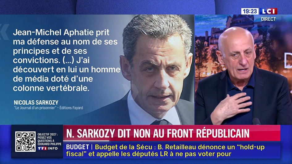 On se souvient en effet comment, dans un long tweet grandiloquent (26/09), Jean-Michel Aphatie s'était porté au secours de l'ancien président : « Je ne comprends pas comment des juges ont pu rendre, au nom du peuple français, une décision aussi aberrante, inquiétante et finalement injuste. » Une prise de position que Jean-Michel Aphatie avait pu développer la veille dans « Quotidien » (« Une décision spectaculaire, violente et problématique », 25/09) et deux jours plus tard sur LCI, (« Je suis un peu bouleversé par cette décision de justice », 28/09), et qui lui avait valu, le temps de quelques jours, de devenir « la coqueluche » [1] (en réalité, la caution) de la presse de droite et d'extrême droite.