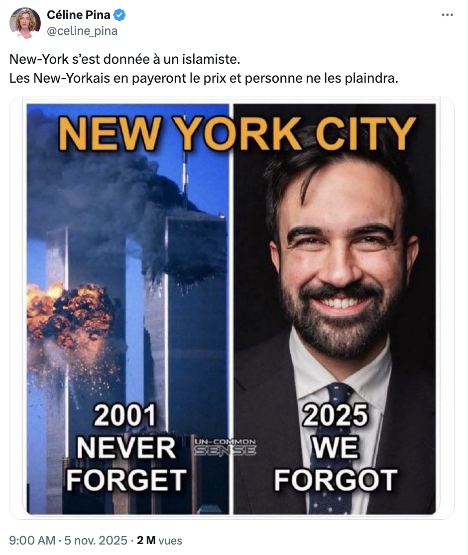 « Frériste », « quasi ouvertement antisémite », « islamogauchiste », « musulman » : la chroniqueuse Céline Pina en avait assez pour conclure et va décrocher haut la main, et en un seul tweet, la palme de l'ignominie raciste : « New-York s'est donné à un islamiste », écrit-elle en partageant un montage qui rapproche une photo de Mamdani et les attentats du World Trade Center, surmonté de ce commentaire : « 2001, n'oublions jamais – 2025, nous avons oublié ». Un dérapage authentiquement raciste, qui consiste (parce qu'il est musulman) à assimiler Mamdani à un terroriste.