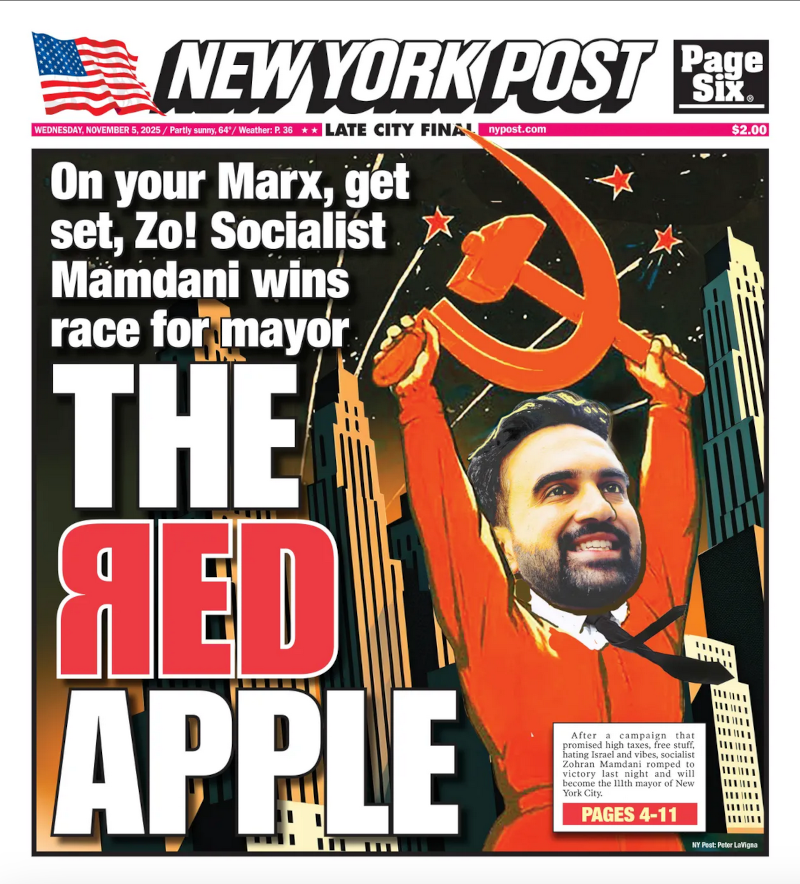 « Même le très démocrate "New York Times" a publié des articles peu flatteurs et n'a pas endossé sa candidature », résume sobrement Solveig Godeluck dans Les Échos (3/11), qui rappelle que le tabloïd de Rupert Murdoch The New York Post « a appelé à voter contre "le socialiste radical, antisémite" » et « a pilonné le candidat avec des couvertures ». Le jour de la victoire du candidat socialiste, le tabloïd ne s'est d'ailleurs pas embarrassé de subtilités et a titré « The Red Apple », en plaçant une faucille et un marteau entre les mains de Zohran Mamdani dans un montage grossier.