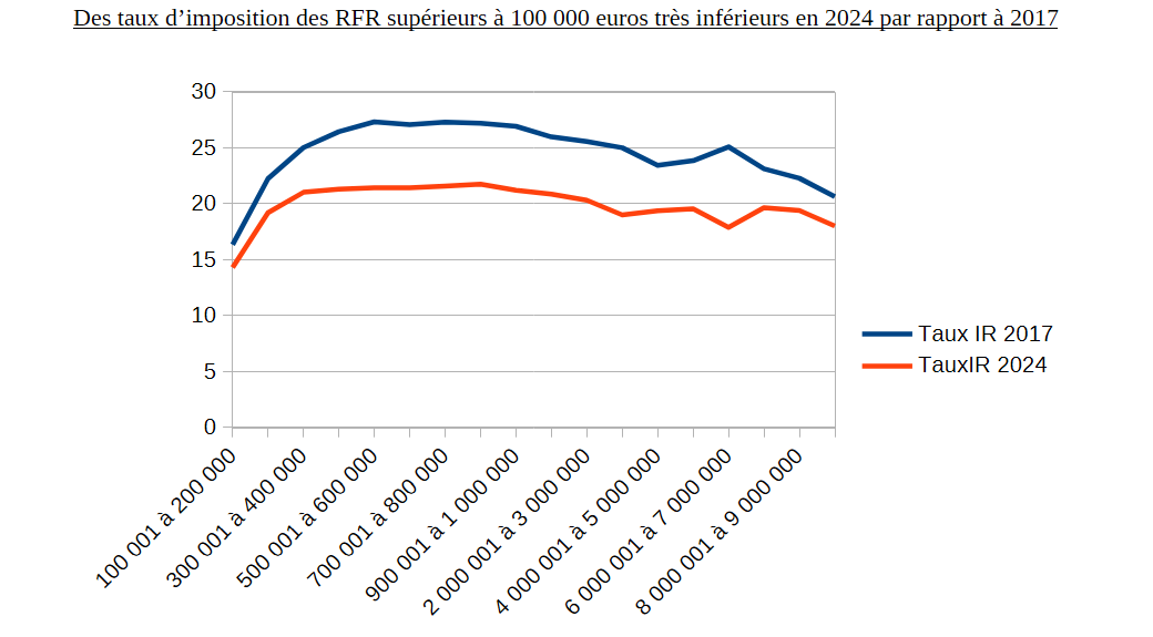 Loin d'atteindre le taux marginal du barème de l'impôt sur le revenu (45 % pour la part du revenu imposable se situant au-delà de 177 106 euros pour les revenus de 2023 imposés en 2024), ce taux d'imposition n'atteint que 20,83 % pour les foyers dont le revenu fiscal de référence (RFR) se situe entre 1 et 2 millions d'euros et passe sous les 20 % au dessus de 2 millions d'euros.