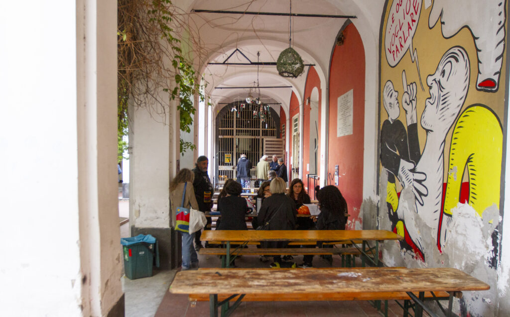 Le problème c’est qu’il y a des gens qui viennent juste pour profiter d’un service gratuit : c’est un risque, il faut le reconnaître. Tous les gens qui viennent faire de la gym – parce qu’on a de la gym, on a du théâtre, on a des choses plus détachées de la politique qui sont proposées ici – tous ces gens ne restent pas. Ce qu’on a remarqué, c’est que la manière de faire rester les gens, c’est de faire une activité qui débouche sur un aspect politique. Par exemple, on commence le périscolaire pour les enfants du quartier, parce qu’il y a un taux d’abandon scolaire énorme à Naples, surtout dans les quartiers populaires comme ici. Donc nous, on essaie de rattraper ces jeunes en leur proposant des petits cours après l’école, et ça fonctionne très bien. On pourrait s’arrêter là, comme beaucoup d’associations, catholiques ou autres, qui font ça. Mais nous, on dit : « on veut connaître votre contexte familial, on veut parler avec vos mères ». Donc on organise des rencontres avec les mères, pour les interroger sur les problèmes qu’elles rencontrent. L’enquête permet de comprendre que ces familles aux très faibles revenus ont le droit d’avoir les manuels scolaires gratuitement, donc ne les achètent pas, mais que les livres gratuits, du fait de retards et de négligences bureaucratiques, n’arrivent pas en septembre à l’école, mais en janvier de l’année suivante ! Les enfants n’ont donc pas de manuels pendant 3 à 4 mois, ils perçoivent une différence avec les autres qui les ont, ils utilisent aussi cette situation comme excuse pour ne pas travailler, et tout ça, ça contribue à déterminer les difficultés scolaires des enfants issus des classes populaires.