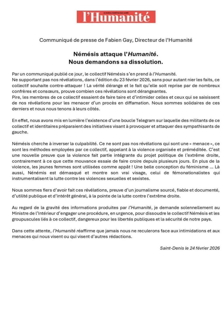 Suite aux révélations de l’Humanité, Nemésis a tenté de contre-attaquer en menaçant ce journal de poursuites. Nous reproduisons ci-après le communiqué de son directeur, Fabien Gay.
