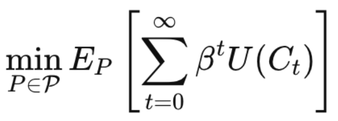 Où P est un ensemble de distributions plausibles et admissibles (non comprises donc celles qui conduisent à un scénario climatique inacceptable). L’objectif est de choisir la meilleure politique P parmi un ensemble P de politiques admissibles. Il s’agit de maximiser au sein de ces politiques, l’espérance de l’utilité minimale de chacun des scénarios.