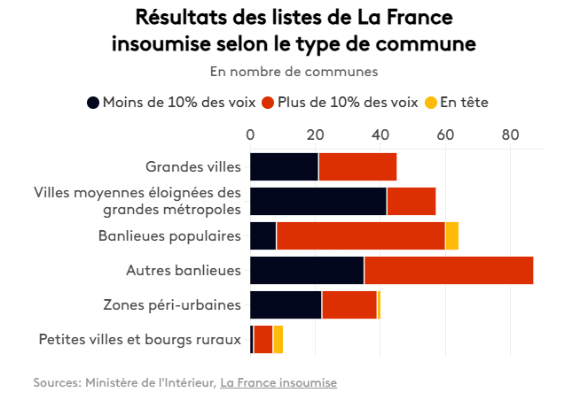 À Paris et Marseille, les listes d’union de la gauche hors LFI emmenées par le PS réalisent des scores suffisamment haut pour penser pouvoir se priver des voix de LFI. À Marseille, face au risque du RN, l’insoumis Delogu s’est retiré en vue du second tour. Le pari du maire sortant est de se faire élire sans LFI, ce qui peut paraitre risqué face au spectre de l’extrême droite, mais demeure un calcul relativement tenable. À Paris, où les chances de Rachida Dati sont réelles, Sophia Chikirou a maintenu sa candidature suite au refus de fusion technique essuyé de la part du candidat PS.