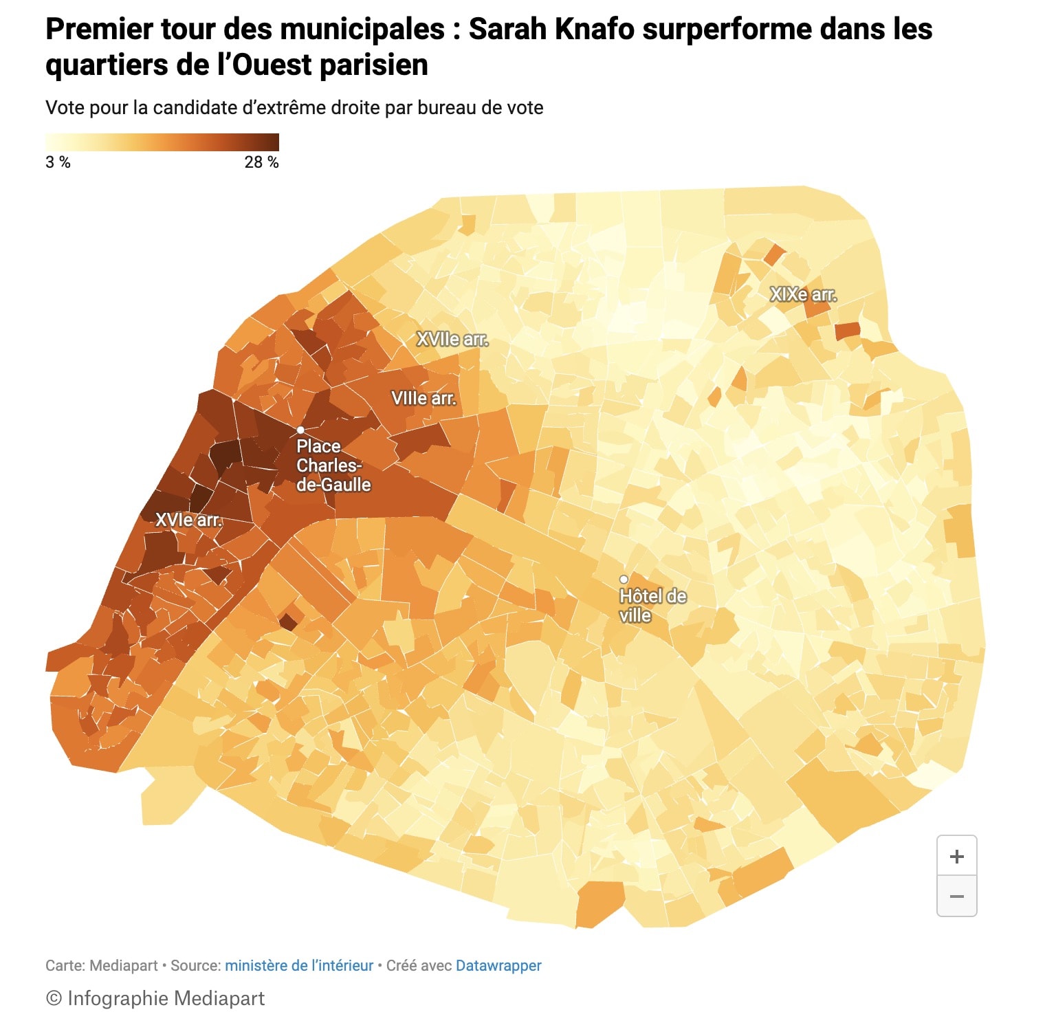 Tout cela a résulté sur un score assez médiocre de 10 % (12% en ajoutant le candidat RN), au niveau de l’extrême droite dans la capitale lors des scrutins précédents, et pratiquement uniquement dû aux scores obtenus dans les 16e (22%) et 8e arrondissements de Paris où se concentrent les plus hauts revenus.