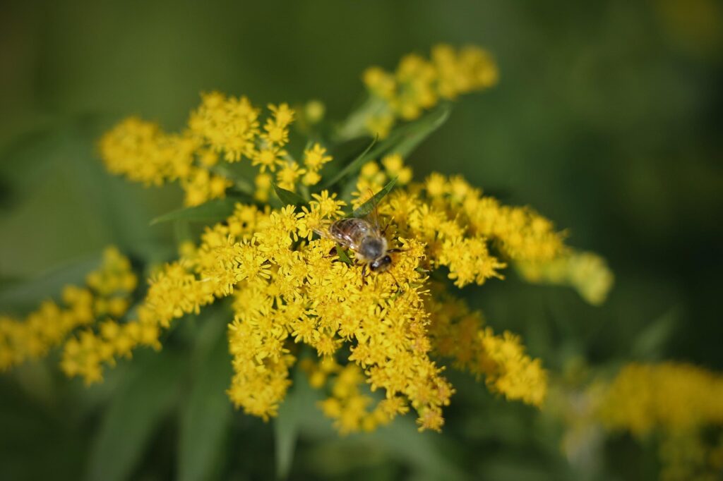 Le solidago (Verge d’or ou solidage), une fleur des champs souvent considérée comme une mauvaise herbe, est extrêmement important pour les abeilles. Ses fleurs apparaissent tardivement et son pollen est une source importante de protéines pour les abeilles à la veille de l’hiver.