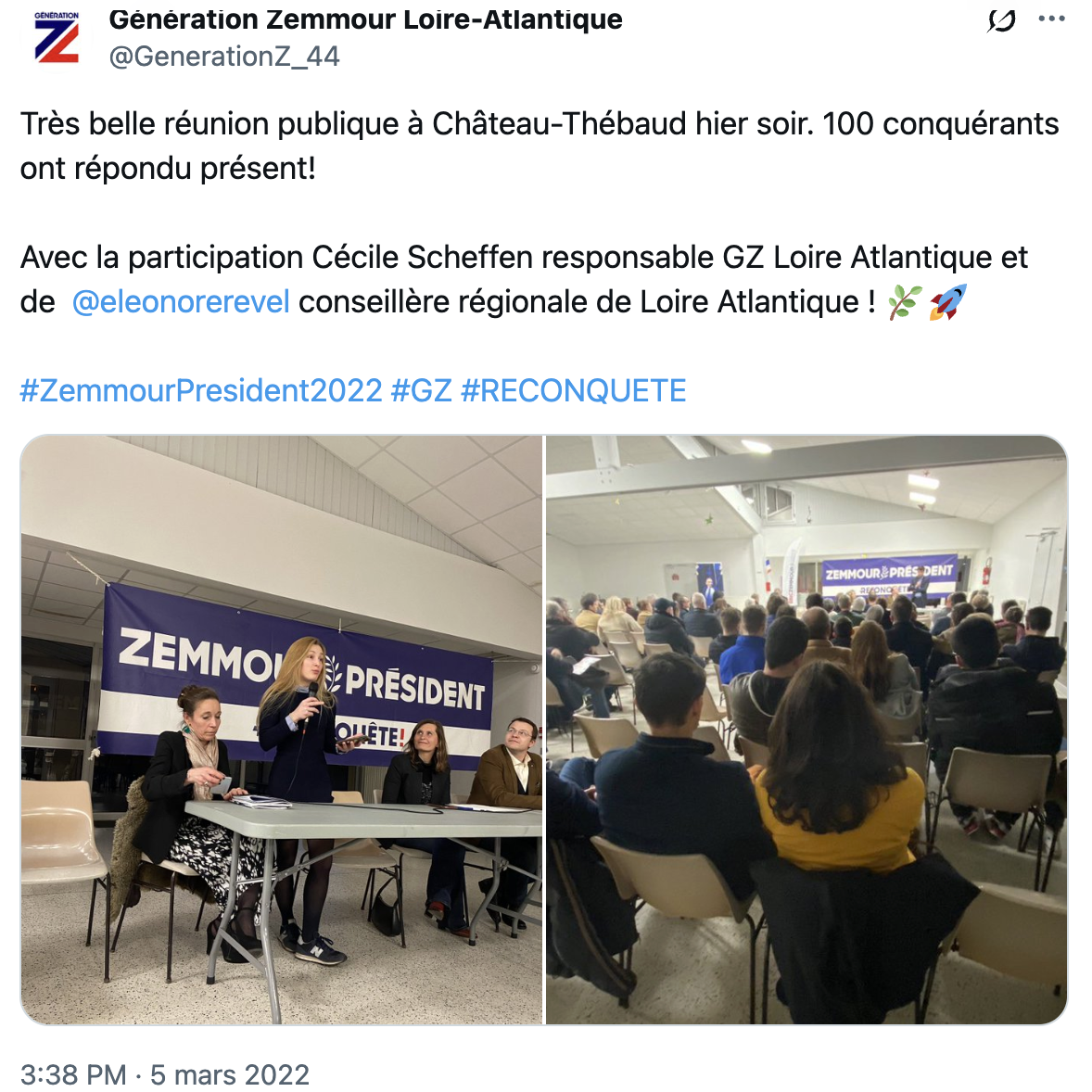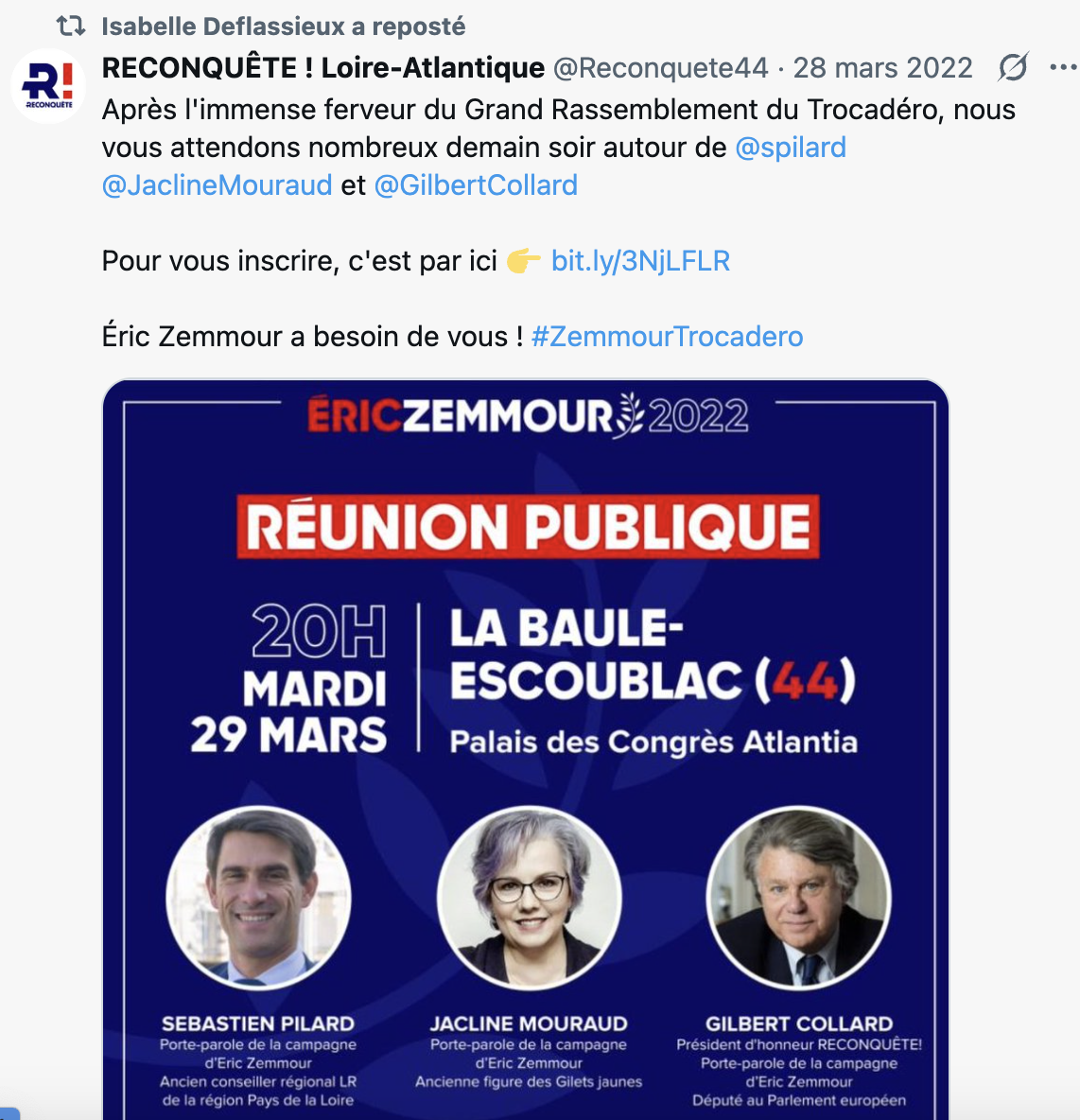 Isabelle Deflassieux s'est également impliquée directement dans cette campagne. Un cliché obtenu par l'Observatoire des multinationales montre la salariée d'Obole participer à l'organisation d'une réunion publique de Reconquête Loire-Atlantique à Château-Thébaud le 4 mars 2022. Isabelle Deflassieux y apparaît sur scène aux côtés de Cécile Scheffen, alors présidente de Génération Z dans le département, qui sera quelques mois plus tard candidate aux législatives, et d'Eléonore Revel, conseillère régionale Reconquête en Loire Atlantique et ancienne candidate à la mairie de Nantes sous la bannière Rassemblement national.