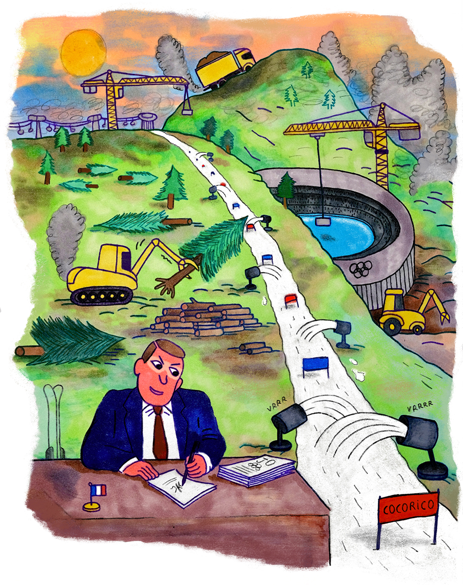 Si la comparaison semble exagérée, on peut comprendre la pression autour du maintien de l'économie du tourisme, principal pourvoyeur d'emploi du département. Pour les élu·es, il s'agit de naviguer entre l'économiquement possible et l'écologiquement souhaitable. Un équilibre précaire qui les conduit souvent à une posture de déni et d'irresponsabilité. Pierre Leroy, adjoint au maire de Puy–Saint-André, une commune à proximité du site olympique de Briançon, le déplore : « Des évènements comme les JO, ça engage nos territoires pour 20, 30 ans. On a l'habitude de leurs héritages, et bien souvent, ce sont des dettes. Alors comment peut-on aujourd'hui le refuser ? »
