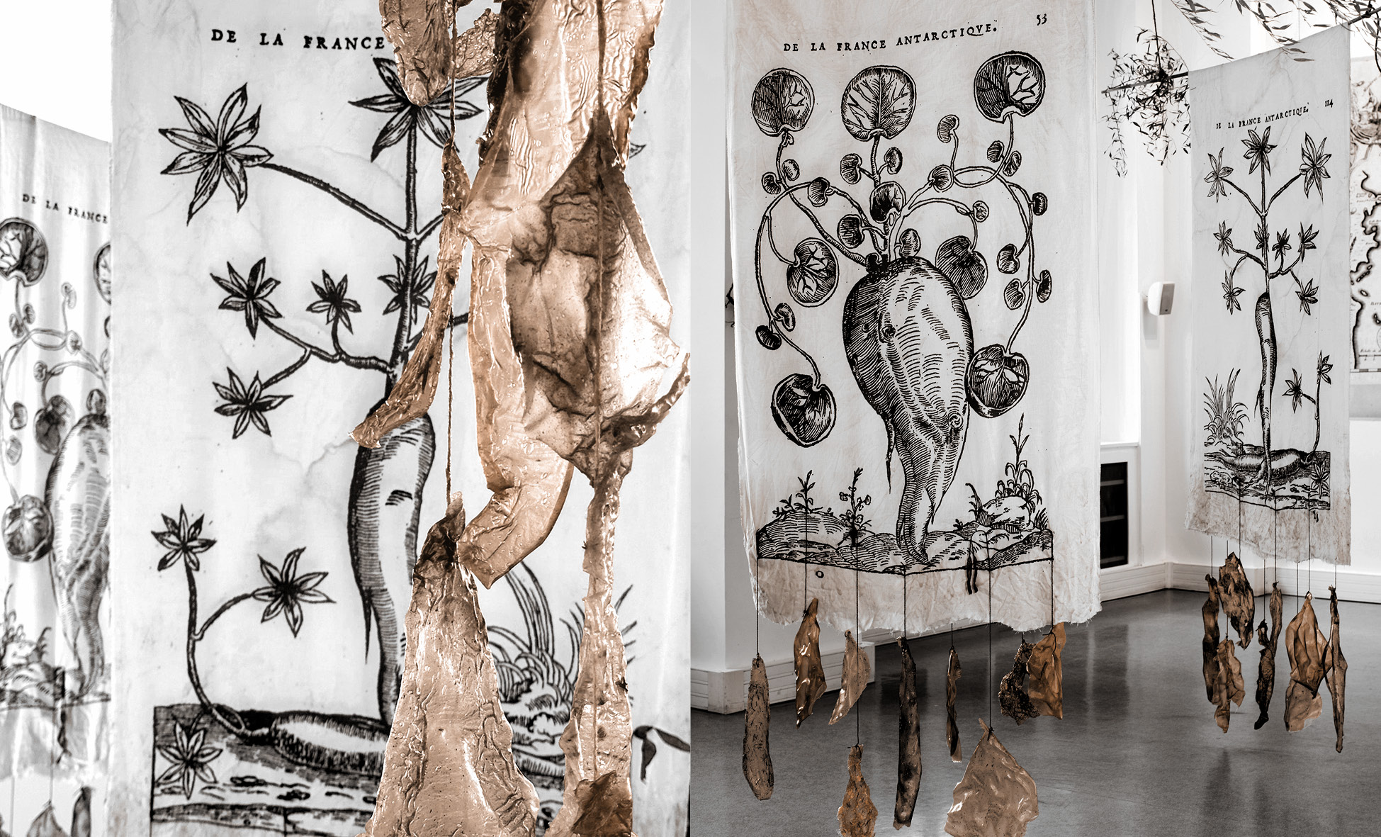 Tout récemment, Bianca Dacosta a démarré un travail d’appropriation d’images archivées à la BnF (Bibliothèque nationale de France). Ces images ont été sélectionnées, d’une part, dans Les singularités de la France Antarctique (1557) et La Cosmographie Universelle (1575) écrits par André Thévet, cosmographe du roi de France, catholique et d’autre part, dans Histoire d’un Voyage fait en la terre du Brésil autrement dite Amérique de Jean de Léry (1536-1613), un Français envoyé en 1556 par Jean Calvin avec treize Genevois en France Antarctique, qui revint de ce voyage en 1560 et dont le livre fut publié en 1578.