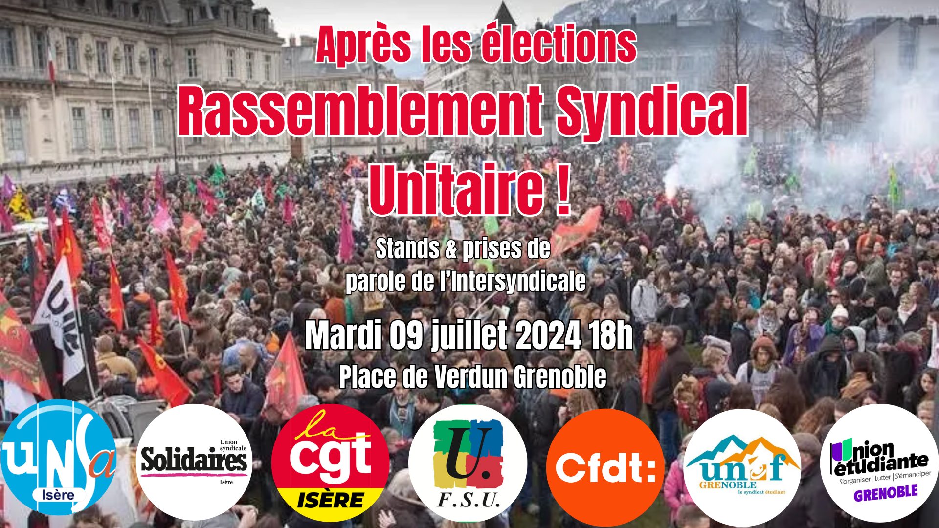 Rassemblement intersyndical unitaire - Stands et prises de parole - Mardi 09 Juillet 2024 à 18 h - Place de Verdun Grenoble