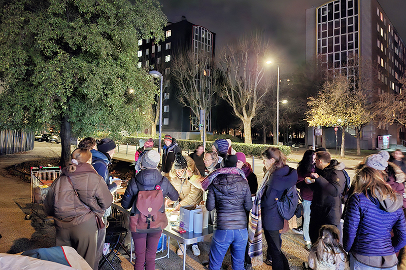Les membres du collectif ont pu partager un repas préparé par les personnes de la mosquée, mardi soir, avant de plier les tentes… au moins pour quinze jours. © Manuel PavardMais « rien n’est réglé sur le fond », tempère l’enseignante. « Dans quinze jours, on sera encore en hiver. Et surtout, on n’a toujours aucun retour des institutions », s’insurge-t-elle. Et de prévenir que le collectif est prêt à réinstaller le campement au terme de ces deux semaines. Chrystelle Blanc-Lanaute explique par ailleurs que les parents et profs mobilisés vont se mettre en lien avec l’intercollectif des écoles occupées « pour évoquer la question des collèges ». Car la situation du collège Vercors est loin d’être unique, souligne-t-elle, rappelant la poursuite de l’occupation du siège de la Métropole. Son constat est ainsi sans appel : « L’État est défaillant. »