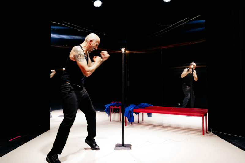 Dans l’espace intime du Petit théâtre, le public attend l’entrée en scène de l’acteur. Deux immenses miroirs, un banc rouge, une ampoule allumée sur un pied de lampadaire, un espace blanc au sol, de petite dimension. L’espace scénique est exigu, à l’image de la cellule de 9 m² de l’homme emprisonné qui en retient deux éléments : son lit et son miroir. « Et voilà, les grandes lignes de la scénographie étaient posées », précise le co-auteur, metteur en scène et scénographe Enzo Verdet.