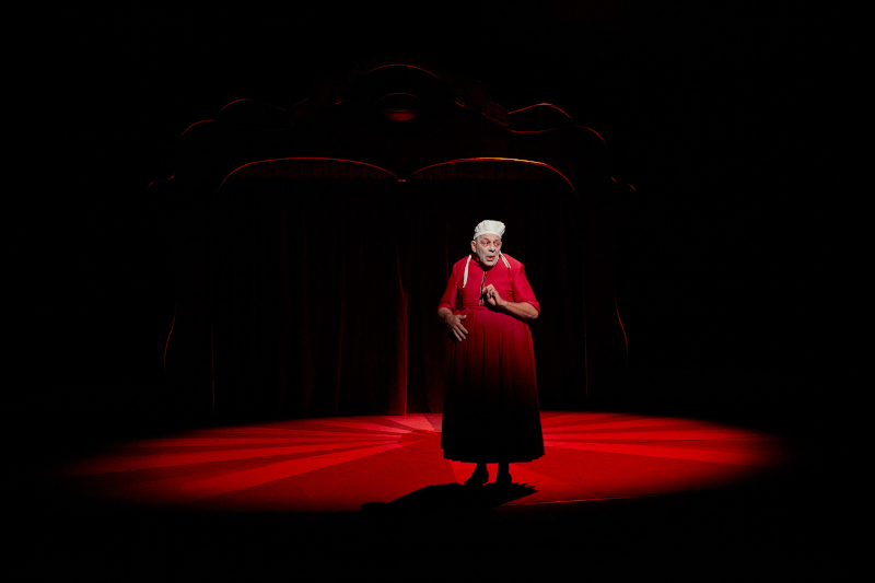 Christian Hecq dans le rôle de la Tantine. © Fabrice RobinLa mère annonce qu’elle ne veut pas de ces créatures. Immédiatement, Mary Hilton la sage-femme y voit une aubaine et les adopte. Devenue leur Tantine, elle élève les filles pour pouvoir les exhiber dans les foires dès l’âge de trois ans, moyennant quelques pennies.