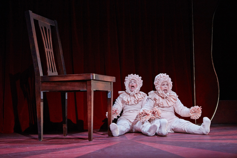 Régine HausermannLa scène de l’accouchement ouvre le spectacle devant l’entrée d’un lieu de plaisir. Rodolphe Poulain – au gabarit imposant — dans le rôle de la parturiente en costume de stripteaseuse, implore le secours de sa patronne — sage-femme à ses heures – au gabarit plus modeste, en robe rouge, interprétée par Christian Heck qui nous régale d’un jeu outré, transformant son corps en marionnette vivante. L’accouchement est traité en théâtre d’ombre et donne lieu à de nombreux effets comiques qui ne s’embarrassent pas de bienséance ! Enfin des pleurs se font entendre. Stupeur ! Deux fillettes apparaissent. Des jumelles ! Mais non, elles sont liées au niveau de la colonne vertébrale : des « monstres » ! des siamoises !