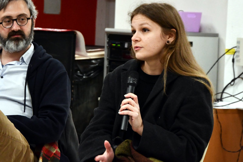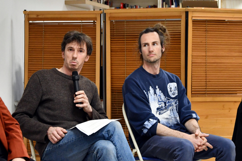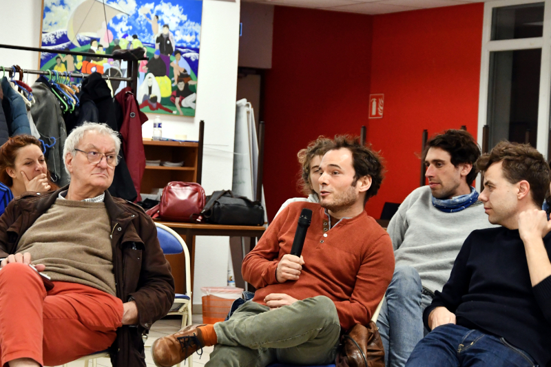 À gauche, Michel, voisin et premier « témoin » de Thomas, et au micro, Antonin.C’est la rencontre avec un autre Michel, également militant communiste, qui sera décisive pour Thomas Petit. Après quelques échanges et hésitations, ceux-ci décident finalement de sortir un livre, s’accordant sur le choix des douze militants interrogés et photographiés, issus des sections PCF de Grenoble, Échirolles et Fontaine. Un panel varié, mêlant hommes et femmes de plusieurs générations, de l’étudiante de 25 ans au retraité de 88 ans.