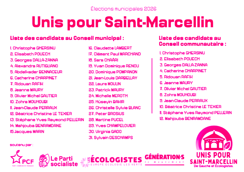 Christophe Gherrsinu.L’équipe « Unis pour Saint-Marcellin » revendique d’être de gauche, écologiste, et profondément attachée à la justice sociale et à l’intérêt général. Autour de Christophe Ghersinu et Elisabeth Pouech, elles et ils entendent donc engager une transformation ambitieuse et démocratique sur la santé, la culture et la vie associative, l’écologie, les mobilités, la solidarité avec toutes les générations, la tranquillité publique, le commerce. Autant de sujets et de propositions repris par Christophe Ghersinu dans son intervention et détaillés dans le programme de la liste.