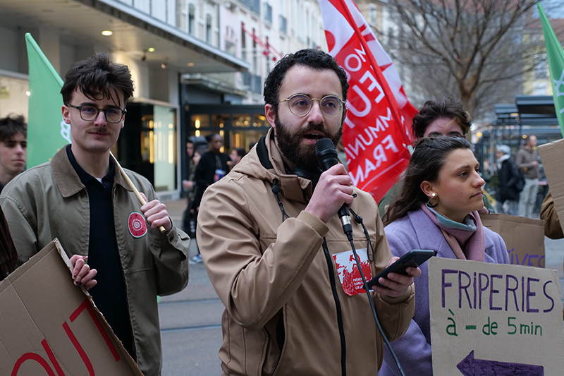 Un combat commun pour les militant-es de différentes organisations de jeunesse de gauche. © Maelis LecomteMalgré une mobilisation massive — avec une pétition signée par près de 10 000 personnes — et une intense polémique nationale, Shein a finalement ouvert ses portes à Grenoble mercredi 25 février, avec trois mois de retard sur la date envisagée initialement. D’où le rassemblement visant un double objectif, indiquent les organisateurs dans leur communiqué commun : « exiger son départ et dénoncer le système destructeur que Shein représente ».