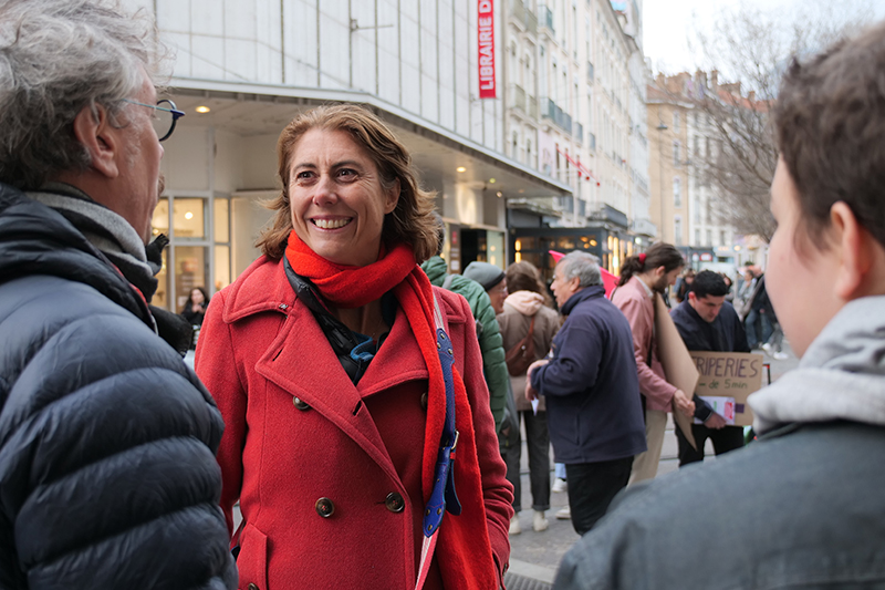 Laurence Ruffin, candidate de la liste d’union de la gauche aux municipales, est venue soutenir les manifestants. © Maelis LecomteLes organisateurs évoquent en outre les « alternatives » existant déjà à Grenoble, à savoir « friperies, ressourceries et commerces locaux engagés ». Ce qui montre, selon eux, « qu’un autre modèle est possible, basé sur le respect des personnes et de l’environnement ». Un combat que les manifestants entendent bien poursuivre, avec d’autres actions en vue dans les prochaines semaines.