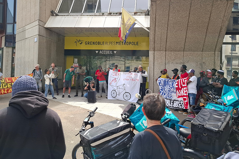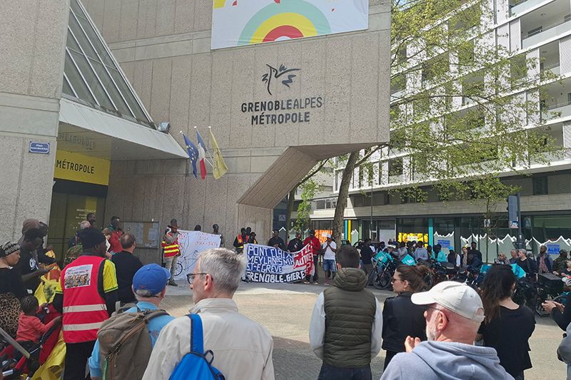 Les manifestants sont venus soutenir les livreurs et leurs familles.Malheureusement, les semaines ont passé, la deadline a expiré et si certaines familles ont pu emménager dans leur nouveau domicile, beaucoup d’autres n’ont pas bougé. D’un côté, estime Raphaël Beth, « la situation a un peu avancé puisque environ 70 personnes ont été relogées dans des bâtiments publics qui allaient rester vides pendant des années »… Et qui le seraient encore sans cette mobilisation. Des édifices « ouverts » par les communes ayant répondu à l’appel lancé en novembre par Christophe Ferrari, président de la Métropole, et Jérôme Rubes (PCF), vice-président chargé de l’habitat et du logement : Grenoble, Échirolles, Saint-Martin-d’Hères, Saint-Égrève, La Tronche, Meylan, Pont-de-Claix, Gières.