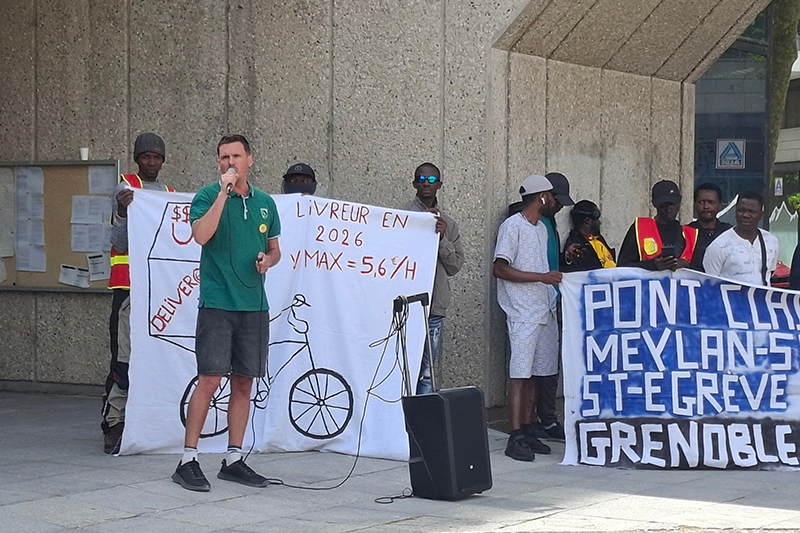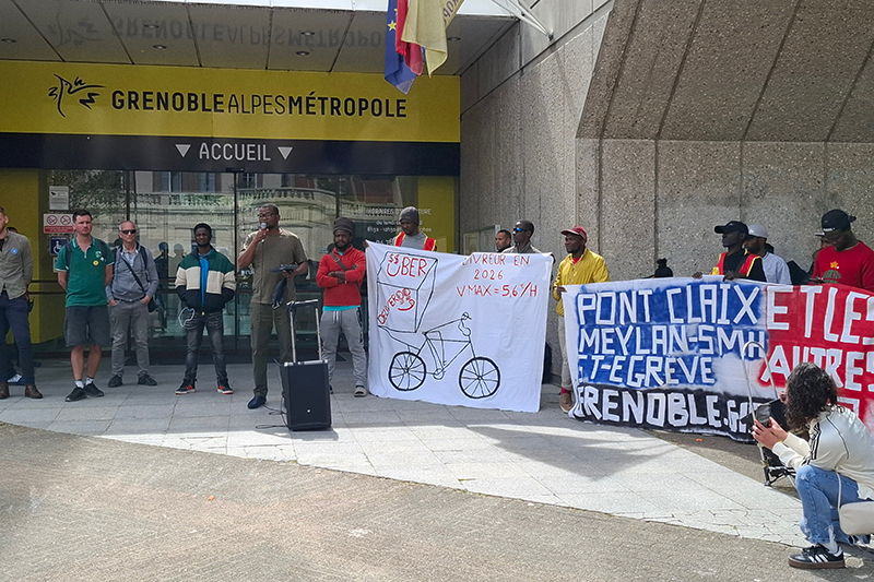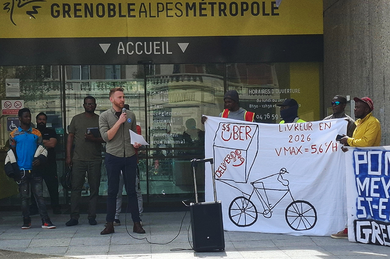 Plusieurs livreurs à vélo ont témoigné de leurs très difficiles conditions de travail.Pour ces plateformes, les livreurs sont censés être en auto-entreprenariat mais « en réalité, c’est une exploitation pure et simple », s’insurge le trésorier de l’association Adali (Association pour les droits et l’accompagnement des livreurs indépendants). Soumis à une pression constante, ne cotisant pas pour la retraite ni pour le chômage, souvent en attente de régularisation, ils sont ainsi « très mal payés », déplore l’orateur au micro, qui pointe les « semaines de 60 heures » pour des salaires généralement inférieurs au Smic horaire.