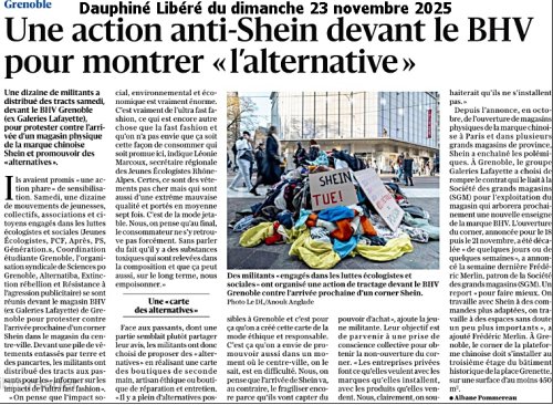 - Samedi 22 novembre 2025 à 14h30, rassemblement contre l'installation de SHEIN à Grenoble, devant le BHV (ex Galeries Lafayette). Voir sur le site. Signez la pétition.