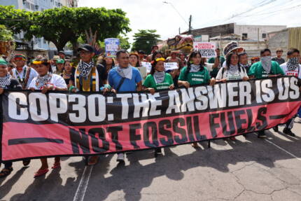 Cette newsletter est également disponible en anglais. Aujourd’hui marque le 10e anniversaire de l’Accord de Paris, lorsque, pour la première fois, les dirigeants mondiaux ont convenu de limiter le réchauffement climatique à 1,5 °C et d’accélérer la transition vers l’abandon des combustibles fossiles. Alors que nous tournons la page de cette année, on a enfin l’impression que le monde commence à bouger — et une partie de ce mouvement va dans le bon sens. Il y a un mois, les dirigeant·es du monde entier se sont réuni·es à Belém, au Brésil, pour la COP30, le sommet annuel de l’ONU où les gouvernements prennent des décisions cruciales pour l’action climatique. Les négociations étaient loin d’être parfaites, mais quelque chose d’essentiel s’est produit. Le pouvoir des peuples a brillé : des organisateur·rices de terrain, des peuples autochtones et traditionnels, des jeunes, des travailleur·euses — et cela a permis de véritables avancées historiques : En Colombie, le gouvernement a déclaré que l’ensemble de l’Amazonie colombienne devient une zone sans combustibles fossiles — une avancée majeure pour les droits autochtones, la protection des forêts et la justice climatique mondiale. Et l’année prochaine, la Colombie accueillera la première Conférence internationale sur la transition juste loin des combustibles fossiles — un espace qui n’existait tout simplement pas avant que les mouvements n’en fassent une exigence. Le pays hôte, le Brésil, a lui aussi franchi une étape importante : il vient d’annoncer le lancement d’une feuille de route nationale pour la sortie des énergies fossiles, ouvrant enfin la voie à une transition énergétique guidée par les communautés. Vous trouverez plus loin un aperçu complet de ce que les peuples — et notre mouvement — ont réalisé à l’intérieur et à l’extérieur des négociations de la COP30. Mais avant cela, je veux vous dire ceci : ce ne sont pas de petites victoires. Ce sont des signes que le monde commence enfin à avancer dans la direction que les communautés réclament depuis des décennies : un avenir où les forêts sont protégées, où les pollueurs rendent des comptes, et où l’accès à une énergie propre devient un droit, pas un privilège. À la fin de 2025, on ressens quelque chose de rare : de l’élan. Un élan réel, mondial, porté par des personnes ordinaires qui refusent d’abandonner. Et pour 2026 ? Nous avons du travail ambitieux et enthousiasmant devant nous — et je suis heureuse que vous en fassiez partie. On vous souhaite du repos, de la chaleur et beaucoup d’espoir en cette période de fêtes. Inscrivez-vous à Notre Énergie News pour recevoir ces nouvelles en premier ! Actualités du mouvement Découvrez nos dernières actions en faveur de la justice climatique et énergétique À Belém, ce sont les peuples — pas les politicien·nes — qui ont mené l’agenda. Plus de 70 000 personnes ont marché pour la justice climatique, tandis que 200 bateaux ont transformé l’Amazone en un appel puissant à protéger le vivant. Dans la zone officielle de l’ONU, banderoles et capybaras géants ont rappelé une vérité simple : les communautés veulent des rivières, pas des pipelines, et une transition qui profite aux gens, pas aux pollueurs. Avec 3 000 représentant·es, l’une des plus grandes délégations autochtones jamais vues a redonné à la COP un ancrage dans la terre, la culture et l’expérience vécue. Nous avons amplifié ce leadership à travers le rituel Amazon Free of Oil and Gas (l’Amazonie libre de pétrole et de gaz) et la première du film Chèr·es Ancêtres de l’Amazonie, le Pacificique, et le soi-disant Canada. Cette mobilisation a contribué à une avancée historique : la démarcation de dix territoires autochtones en Brésil, essentielle pour protéger les forêts et garantir une participation réelle aux décisions climatiques. Avec nos partenaires, nous avons recentré les négociations sur la justice : dénoncer les dégâts des fossiles, exiger un financement pour les populations, et bâtir l’élan autour de la feuille de route TAFF — Transition Away From Fossil Fuels (Feuille de Route pour la Sortie des Combustibles Fossiles), une proposition qui trace comment les pays peuvent sortir du charbon, du pétrole et du gaz en accord avec la science climatique. Soutenue par près de 90 pays, elle n’a finalement pas été adoptée dans le texte final, mais son avancée marque un tournant : la sortie des énergies fossiles est désormais au cœur du débat mondial. Mais une victoire majeure a été obtenue : l’inscription officielle du Mécanisme d’Action de Belém (BAM), un nouveau cadre onusien qui place les travailleur·euses, les peuples autochtones et les communautés au cœur d’une transition juste. Alors que le G20 se tenait pour la première fois en Afrique, nous avons rassemblé travailleur·euses, étudiant·es, artistes et militant·es sous la bannière WeThe 99% pour exiger justice climatique, annulation de la dette et transition rapide vers les renouvelables. Ateliers, assemblées publiques, People’s Summit, festival de mobilisation : la société civile a occupé l’espace. Malgré le nouveau Africa Engagement Framework, les dirigeant·es n’ont pris aucun engagement clair sur la sortie des fossiles ou le financement climat. Nous restons fermes : l’Afrique n’a pas besoin de promesses, elle a besoin de justice et de moyens pour construire un avenir renouvelable. Le jargon du climat Découvrez les termes utilisés par les activistes et les expert·es du climat Le BAM est un nouveau cadre adopté à l’ONU pour garantir que la transition loin des énergies fossiles soit juste : il protège les travailleur·euses, les peuples autochtones et les communautés en première ligne. À la COP30, tout le monde en parlait — badges, banderoles, appels publics. Les mouvements exigeai