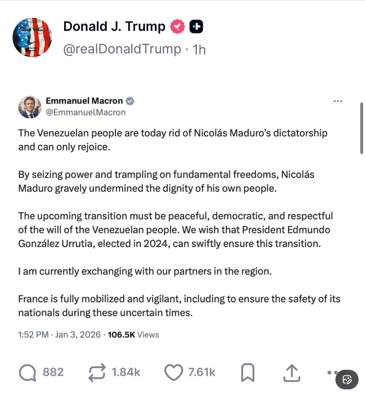 Silence… Puis quand enfin la réaction arrive, c’est un docile alignement d’Emmanuel Macron à Donald Trump. Il finit par poster à 19h30 (heure de Paris) un message sur X dans lequel il semble justifier et non condamner la violation flagrante par les États-Unis du droit international :
