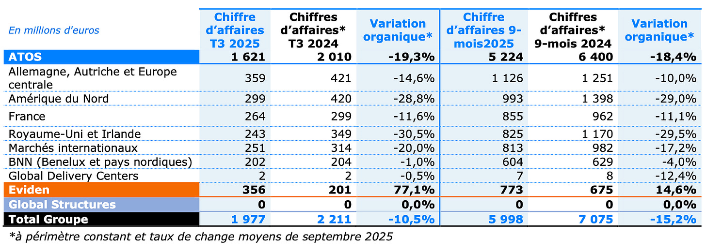 Le tableau est donc celui d’une entreprise en déliquescence accélérée, pas d’un groupe en voie de stabilisation. Pour maintenir financièrement à flot le bateau Atos, la direction joue en fait sur les coûts, et non sur l’activité qui se retrouve en forte baisse. Lors de la communication financière du groupe sur le troisième trimestre 2025, la baisse du chiffre d’affaires est particulièrement marquée sur les marchés de l’Amérique du Nord (– 28,8 % sur un an) et du Royaume-Uni/Irlande (– 30,5 %). C’est une chute significative, car la plupart des contrats d’Atos sont des contrats de long terme auprès d’entreprises dans lesquelles le groupe informatique envoie des équipes d’informaticiens détachés. Il est donc très rare qu’Atos soit confronté à des fortes variations de ce genre. « C’est simple, c’est du jamais vu ! », s’exclame l’ancien haut cadre que j’ai interrogé.