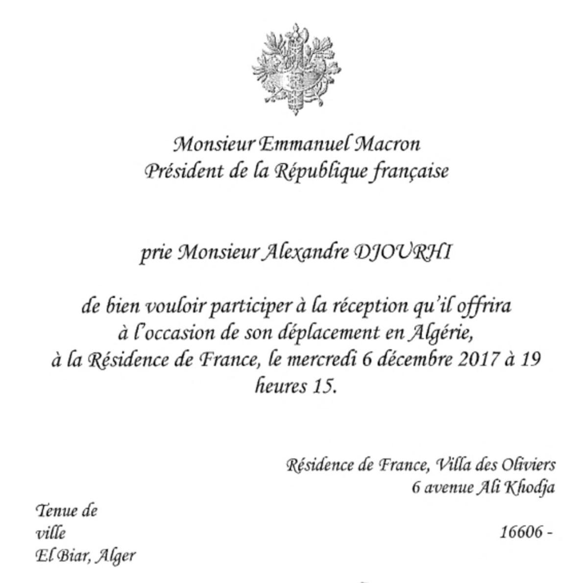 Ce soir-là à Alger, la rencontre fut furtive entre Emmanuel Macron et Alexandre Djouhri. Ce 6 décembre 2017, le jeune président est alors en visite officielle en Algérie, et le soir une réception est organisée par l’ambassade à la résidence de France pour la communauté française. On l’apprendra quelques jours plus tard dans un article du Canard Enchaîné, mais Alexandre Djouhri y a été officiellement invité.