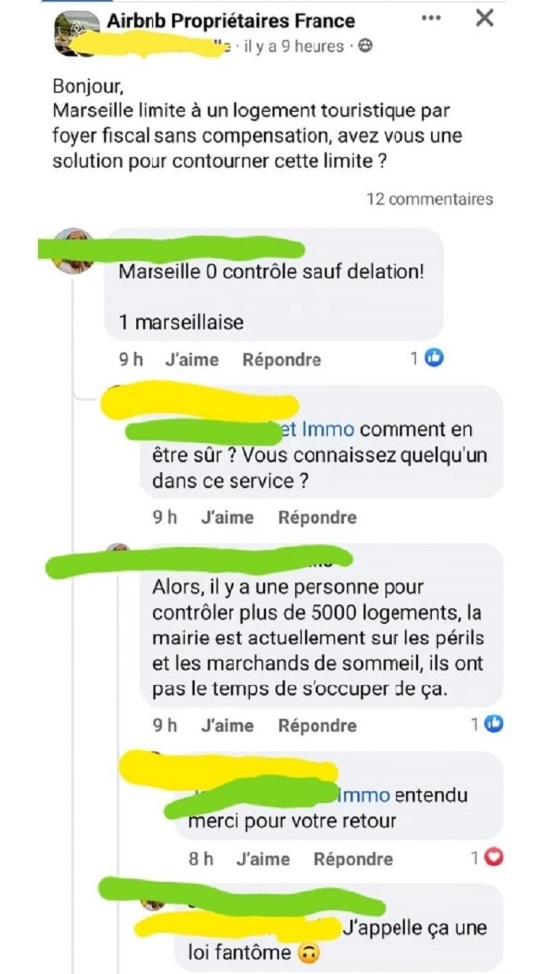 La situation a de quoi faire réfléchir surtout quand, depuis des années, collectifs militants et habitant.e.s répètent que les marchands de sommeil sont en train de se reconvertir, profitent du « meublé touristique » pour éviter le permis de louer à Noailles [2], quartier meurtri par les effondrements et les délogements. Dès 2019, l'association « Un centre ville pour tous » prévenait de la dérive. Car, derrière la communication rodée du mastodonte numérique, de la théorie du « petit coin de canapé sympa pour finir les fins de mois », derrière les propriétaires-occupants stylés genre Yannick Nobile (le communicant de la plateforme à Marseille), beaucoup captent assez vite que le tout sert avant tout à engraisser véreux, gros investisseurs et, par dessus le marché, détruit une bonne partie du parc de logements encore accessible aux Marseillais.es. Devra-t-on atteindre les 99% de fraudes pour en arriver à la conclusion qui s'impose ?
