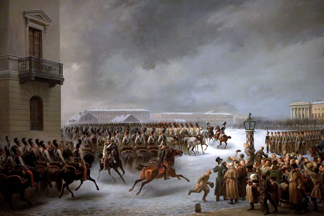 Le 14 décembre 1825 (selon le calendrier julien alors en vigueur en Russie, soit le 26 décembre selon le calendrier grégorien instauré en Europe occidentale depuis le XVIᵉ siècle et que la Russie soviétique reprendra à son compte en février 1918), l’Empire russe se prépare à célébrer l’accession au pouvoir d’un nouveau tsar, Nicolas Ier, 29 ans, frère du tsar précédent Alexandre Ier, décédé un peu moins d’un mois plus tôt. Mais la cérémonie prendra un tour bien différent de celui qui était attendu et la journée restera dans les mémoires comme celle de la « révolte des décembristes » (ou décabristes, du russe « dekabr’ », qui a donné le mot russe « dekabristy »). Cet important groupe de nobles, influencés par les transformations que connaissait alors l’ouest de l’Europe et désireux de faire évoluer le pays vers une monarchie constitutionnelle, cherchèrent sans succès à s’emparer du pouvoir en mobilisant plusieurs régiments de soldats et furent écrasés par la force.