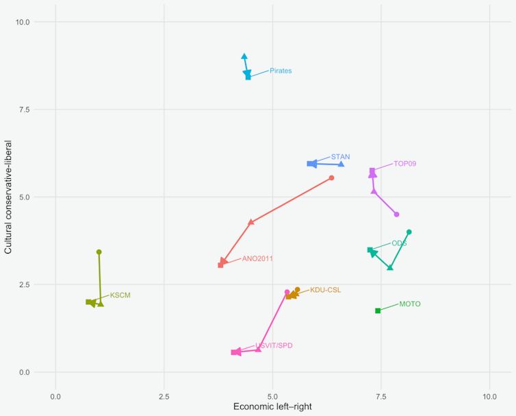 Ce déplacement est visible dans la figure 1, tirée des recherches que j’ai conduites avec plusieurs collègues, qui situe les partis tchèques sur les dimensions économique et culturelle entre 2014 et 2024 : ANO s’y déplace nettement d’un centre-droit libéral vers un conservatisme à tendance sociale.