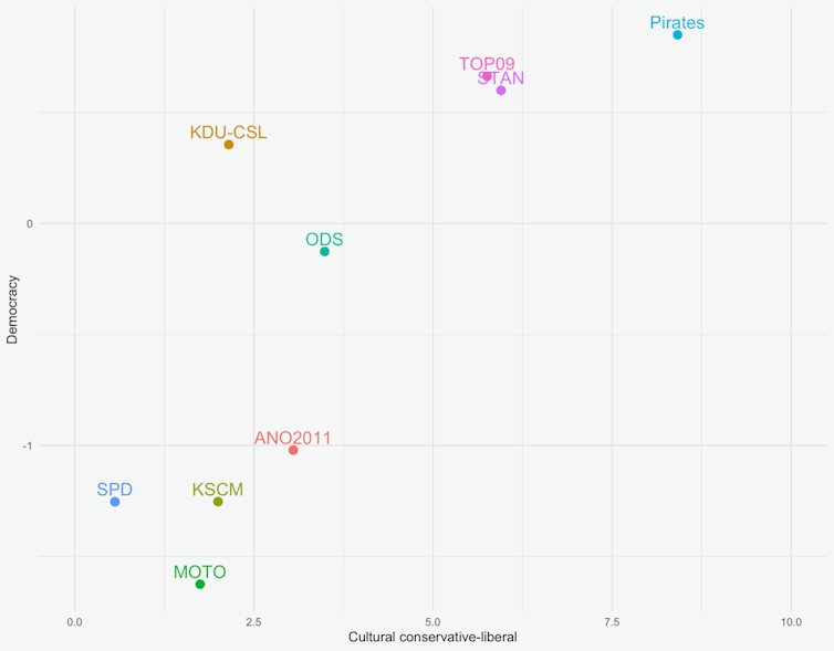 La figure 2 (données du Chapel Hill Expert Survey) montre combien les attitudes culturelles sont liées aux positions sur la démocratie, et illustre la fracture entre ANO et ses alliés potentiels d’un côté, et les partis du gouvernement sortant et les Pirates de l’autre.