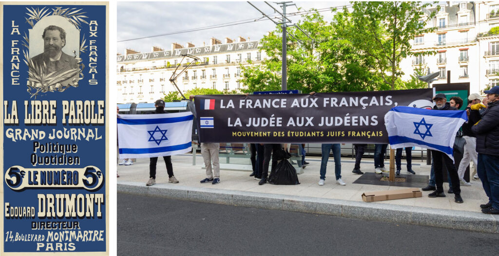 La droite nationaliste, à l’inverse, mit dès lors plus que jamais son mot d’ordre « À bas les juifs ! » au cœur de son projet d’unité identitaire – avant de passer à l’acte contre les intéressés une fois parvenue au pouvoir avec le régime de Vichy. Contrainte à une certaine discrétion là-dessus après 1945, elle n’en est pas moins restée antisémite… par définition, c’est-à-dire pour des raisons structurelles, que les dénis actuels du Rassemblement National et des autres héritiers de cette tradition politique, purement circonstanciels, peuvent seulement masquer malgré leur (toute nouvelle) véhémence .