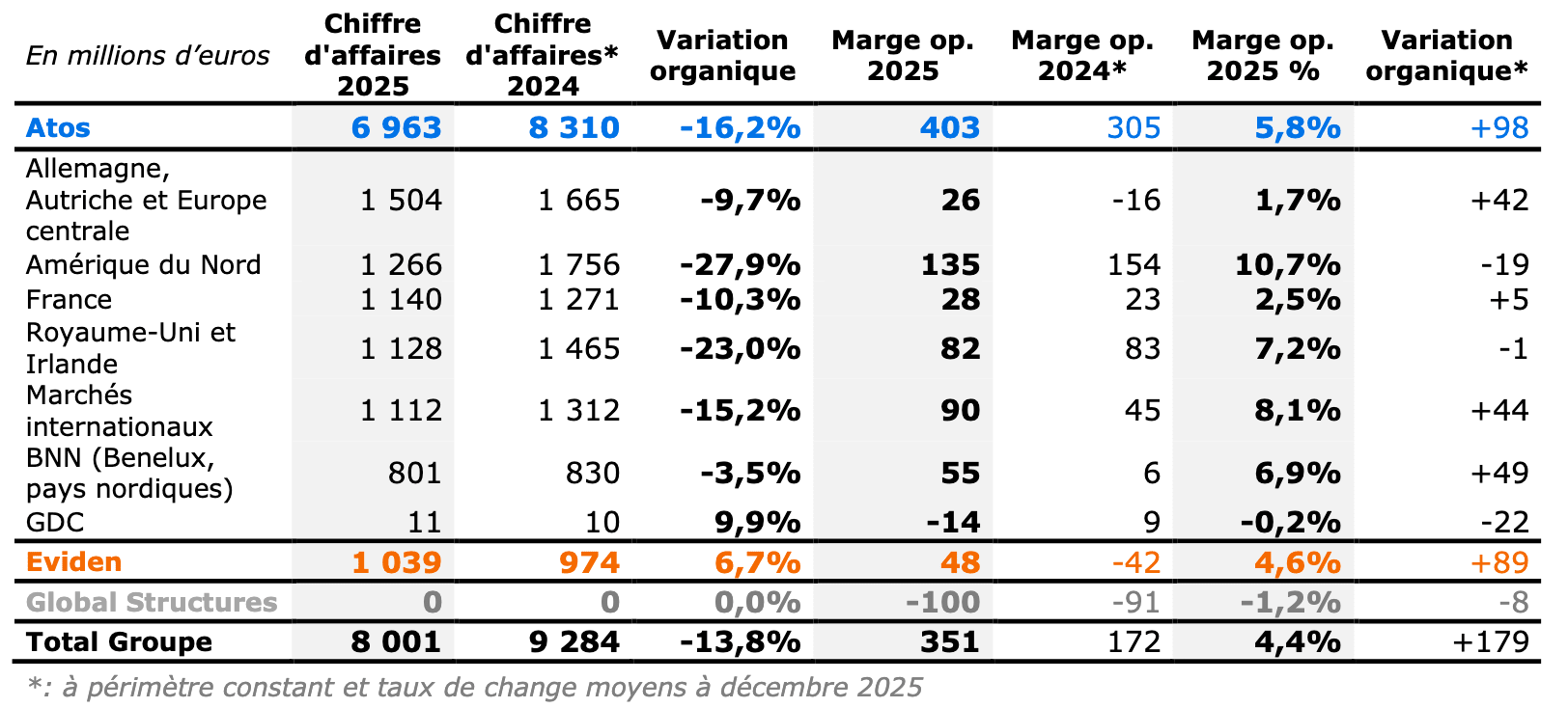 selon des données internes collectées pour janvier et février 2026, le book-to-bill d’Atos France tomberait à 54 % en janvier et en février. Les contrats “red & black” qui désignent, en pratique, des contrats internes classés comme sous-rentables ou destructeurs de valeur suscitent également des interrogations.