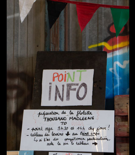 C'est quelque chose qui est plutôt marquant en passant les journées ici. Dans cette zone qui a l'air abandonnée, il y a toujours différents usages, il y a toujours des gens qui viennent pêcher, regarder ce qui se passe, s'intéresser aux travaux en cours ; quand on est en cuisine, toute la journée il y a des gens qui viennent apporter des provisions selon ce qu'iels peuvent emmener. Il y a un flux incessant de dons, de vêtements, de médicaments, de provisions…