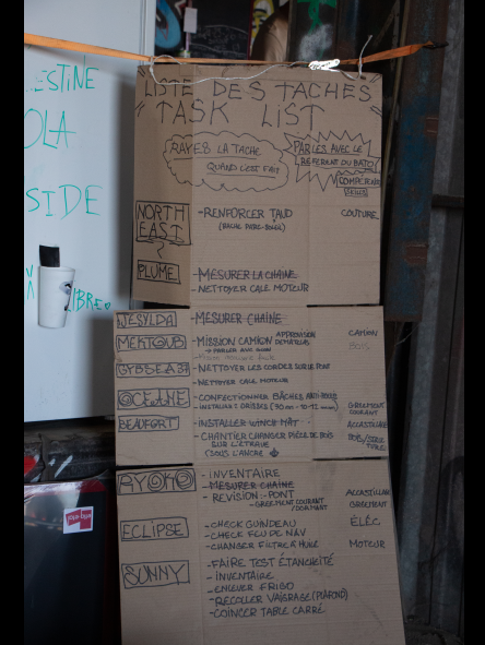 L'accueil que nous avons eu dès le début était assez incroyable. Nous partions de quelque chose d'assez solitaire cet hiver, assez glauque, dans le froid à Port Saint-Louis du Rhône, un chantier à sec peu vivant avec les bateaux hors de l'eau. Alors qu'ici, dès que nous avons commencé à mettre les bateaux à l'eau contre le quai, les pêcheur.euse.s qui étaient à coté sont venus nous voir, nous ont donné du poisson, de l'argent, nous ont dit être très touché-es par ce que l'on faisait quand on leur a expliqué que c'était la préparation de la flottille pour Gaza. Il y a par exemple un pêcheur qui vient souvent ici, qui est à la CGT et qui, dès que l'on a besoin de quelque chose, nous le ramène, des camions de palettes, des tôles… Il a pas mal de contacts et nous a permis de rencontrer beaucoup de monde. C'est très touchant de voir que beaucoup de gens peuvent se saisir de l'objet flottille que nous étions en train de préparer de notre côté. C'est passé de quelque chose de militant à une chose beaucoup plus à tout le monde.