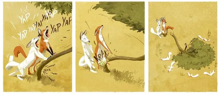 À partir du T2, l’objectif était juste de faire une belle image qui raconte l’histoire et qui permette d’accrocher l’œil du lecteur. J’avais fait plusieurs propositions que j’ai envoyées à Xavier et au studio graphique de Casterman. Finalement, Xavier avait suggéré qu’on reprenne la scène de lutte des animaux qui restent dans le froid pour protester. C’était nickel parce que ça faisait une couverture très frontale, très efficace, ça faisait un très fort contraste noir/blanc avec la couverture du T1. Ça racontait aussi qu’on arrivait dans l’hiver.