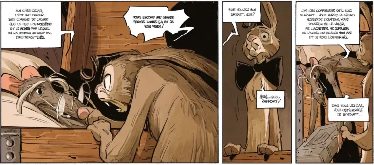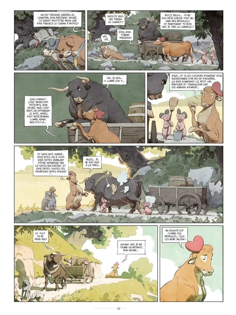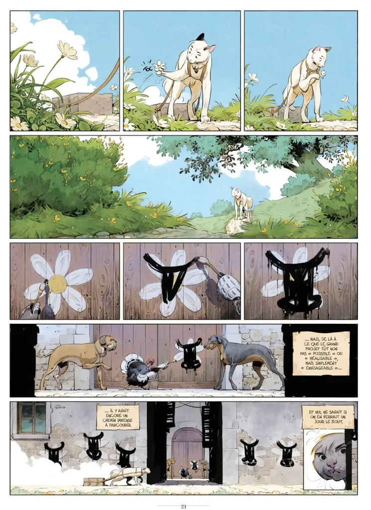L’objectif de la couverture du T1, c’était de poser complètement le cadre de l’histoire, qu’il y ait écrit « Le Château des Animaux », qu’on voie le taureau imposant et sa milice qui dominent le petit chat, dans un château. L’image raconte très clairement toutes les bases de l’histoire et le rapport de force.