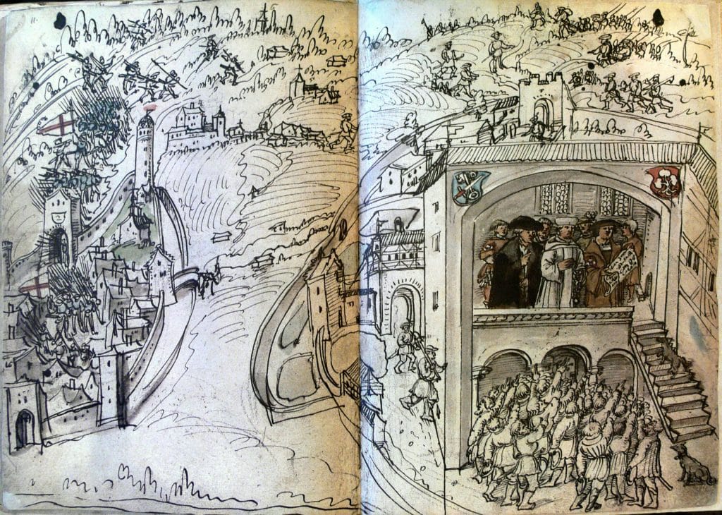 Image d’ouverture : Chronique de Weissenau sur la guerre des paysans de 1525. Archives générales princières de Waldburg-Zeil, château de Zeil, ZA Ms 54, autour de 1525, pages 22-23.