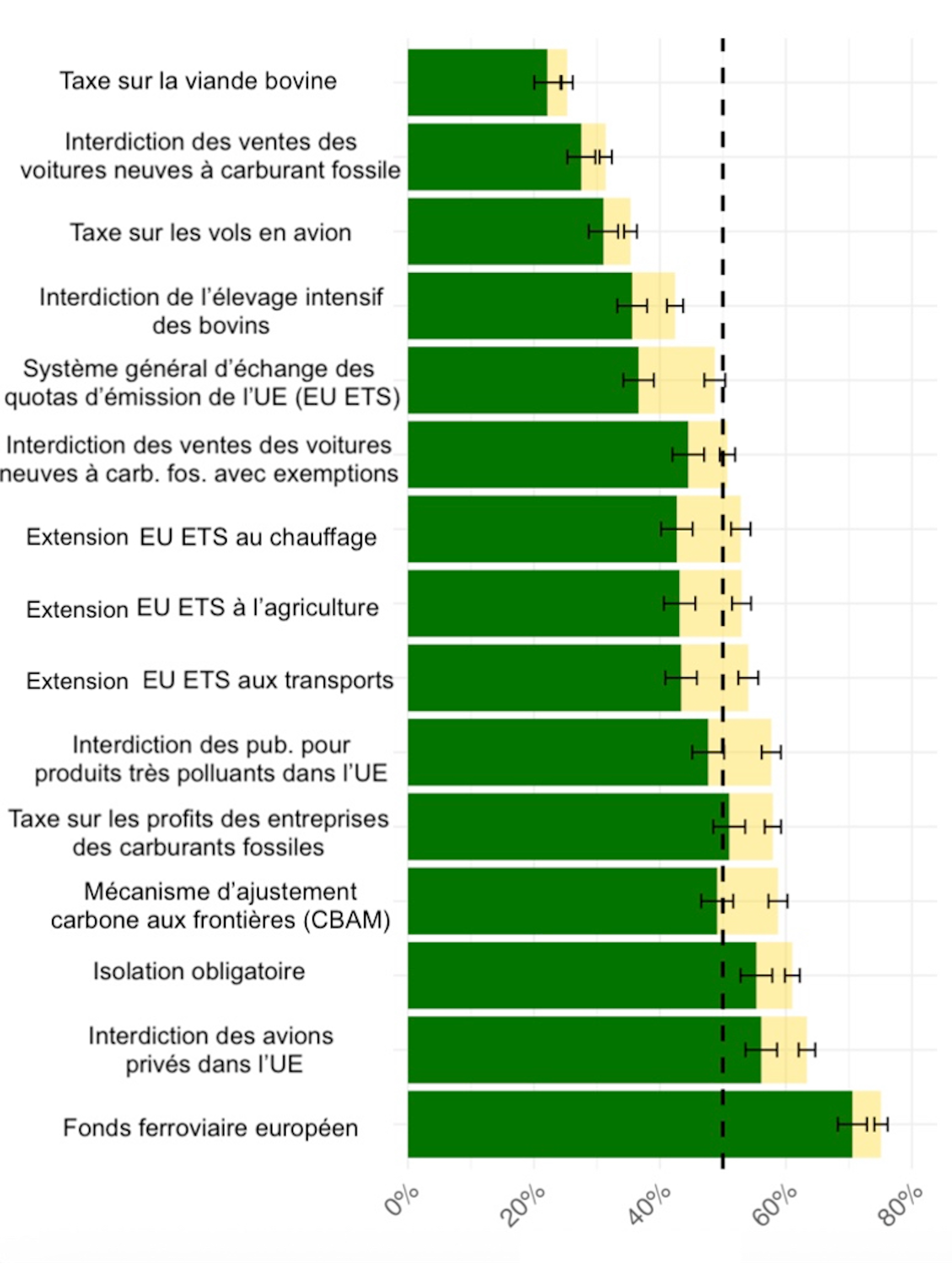 Parmi les 15 propositions que nous avons étudiées), les niveaux de soutien varient considérablement. Les mesures imposant des coûts visibles et directs aux consommateurs (taxes ou interdictions de consommation) ont tendance à rencontrer des difficultés.