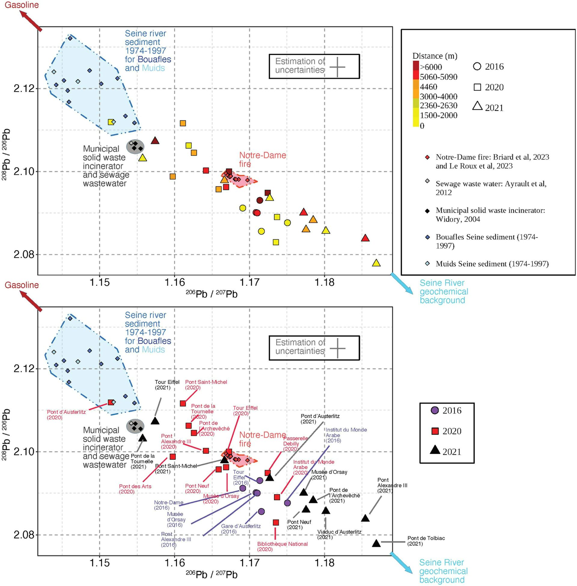 Au contraire, en 2020, après l’incendie de 2019, les niveaux de plomb les plus élevés ont été mesurés au sein des dépôts prélevés autour de l’île de la Cité, où se trouve la cathédrale. Leur signature isotopique était également particulièrement proche de celle de l’incendie, comme le montre le schéma ci-dessus.