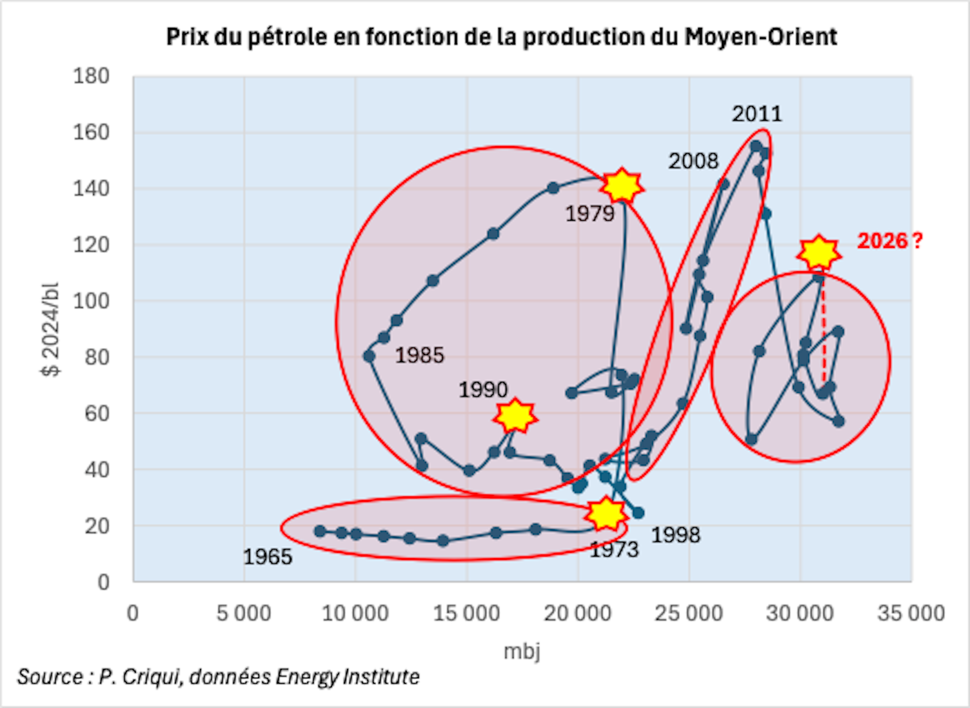 La survenue d’une nouvelle crise internationale majeure au Moyen-Orient et les menaces qu’elle fait peser sur l’approvisionnement énergétique et l’économie mondiale conduisent à s’interroger sur les conditions de déclenchement des chocs pétroliers. On peut définir un choc pétrolier comme une hausse forte (un doublement, voire un triplement) et durable des prix du pétrole. Inversement, un contre-choc correspond à une baisse forte et durable.