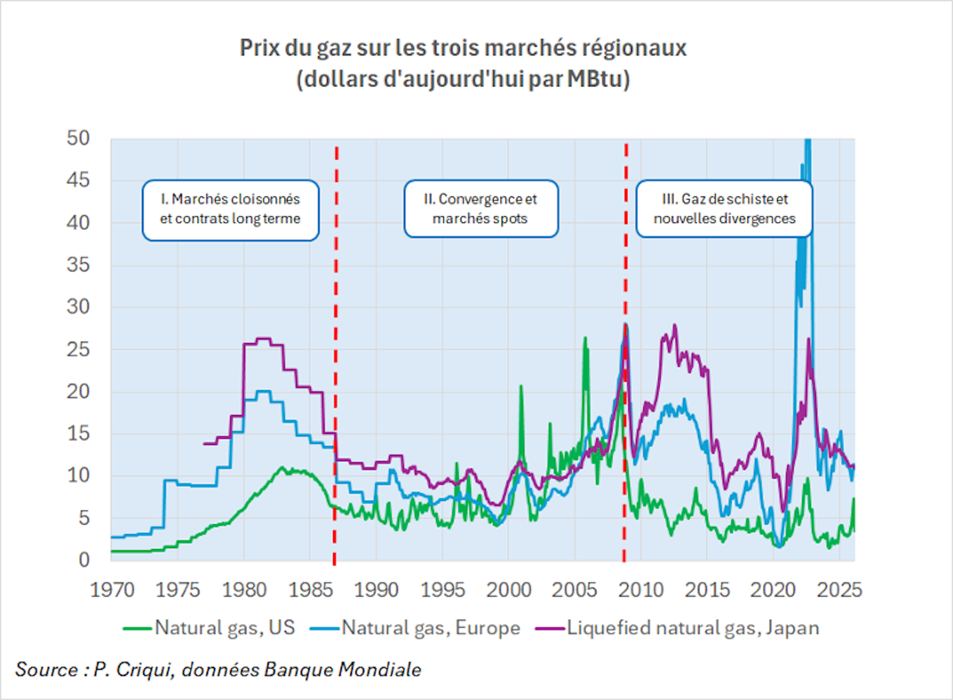1986–2008, une convergence relative : à partir de 1986, la structure des marchés évolue. Le contre-choc pétrolier entraîne une révision des modes de contractualisation, la montée progressive du commerce de GNL, l’ouverture des premières places de marché spot (c’est-à-dire, des marchés sur lesquels les prix sont fixés au jour le jour) et l’assouplissement des conditions d’échange dans certaines régions. Les prix américains, européens et asiatiques demeurent différents, mais leurs évolutions convergent. Cela découle du développement du commerce international de GNL, de la standardisation progressive des infrastructures et des effets d’entraînement d’un marché pétrolier devenu plus volatil. La période n’est toutefois pas homogène. Aux États-Unis, les marchés spot connaissent des pics très prononcés, dus aux contraintes de transport et aux limites régionales des capacités de stockage ou de production. En dépit de ces épisodes régionaux, les prix du gaz reflètent une plus grande cohérence à l’international.